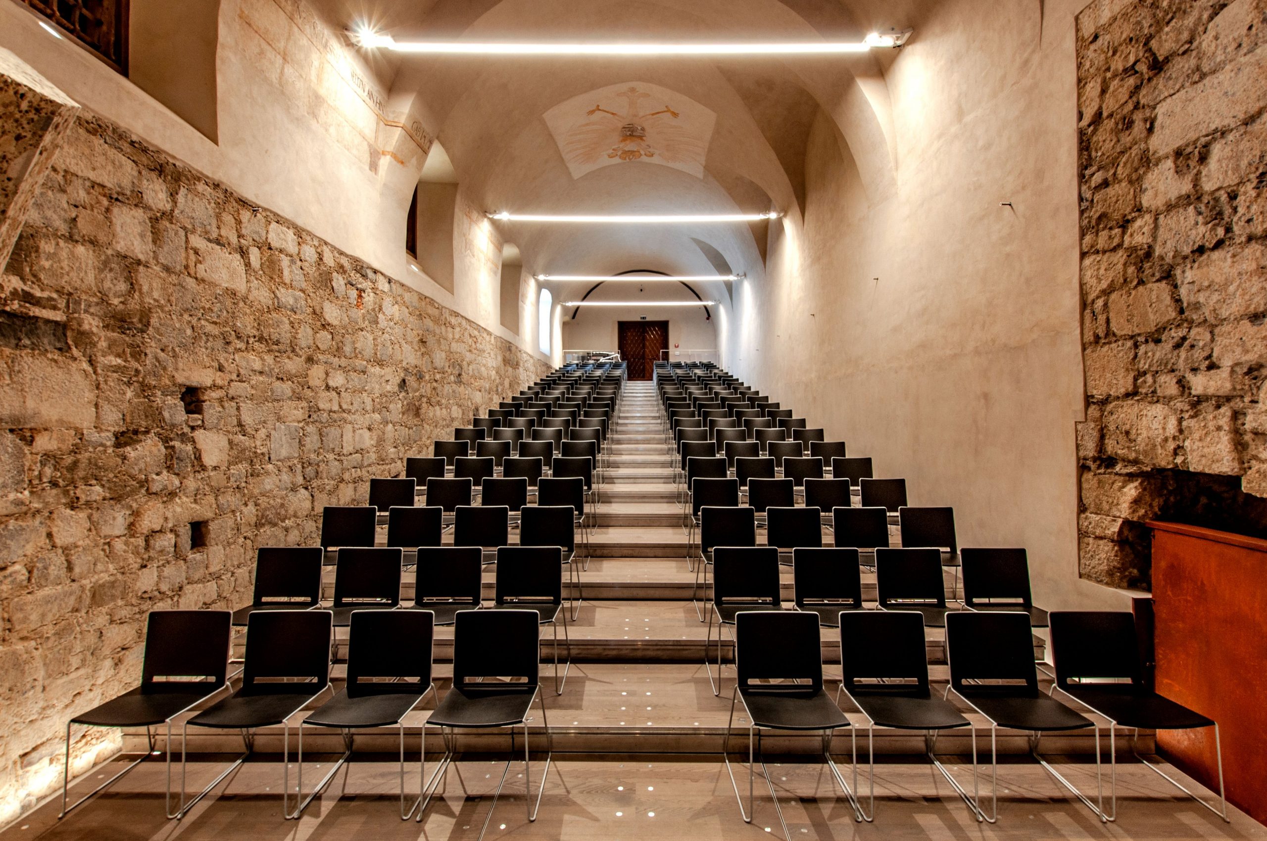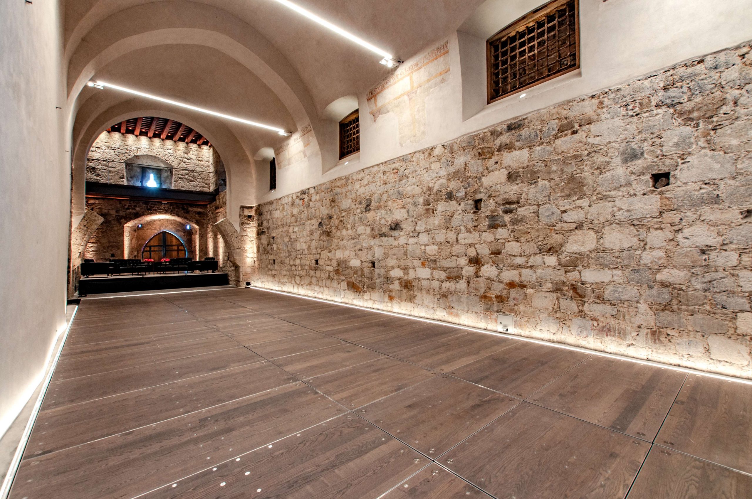 Osim rješenja segmentnog nagibnog podnog sustava, u dvoranu smo ugradili i modularne jedinice sa sustavom škarastih nogu – Airstage, koje čine pozornicu. Scenske jedinice Airstage fiksno su postavljene ispod završne visine poda i rješenje su za brzu i jednostavnu transformaciju prostora događanja. Svaka pozornica ima podkonstrukciju koja omogućuje podešavanje visine prema ostatku poda u prostoriji.
